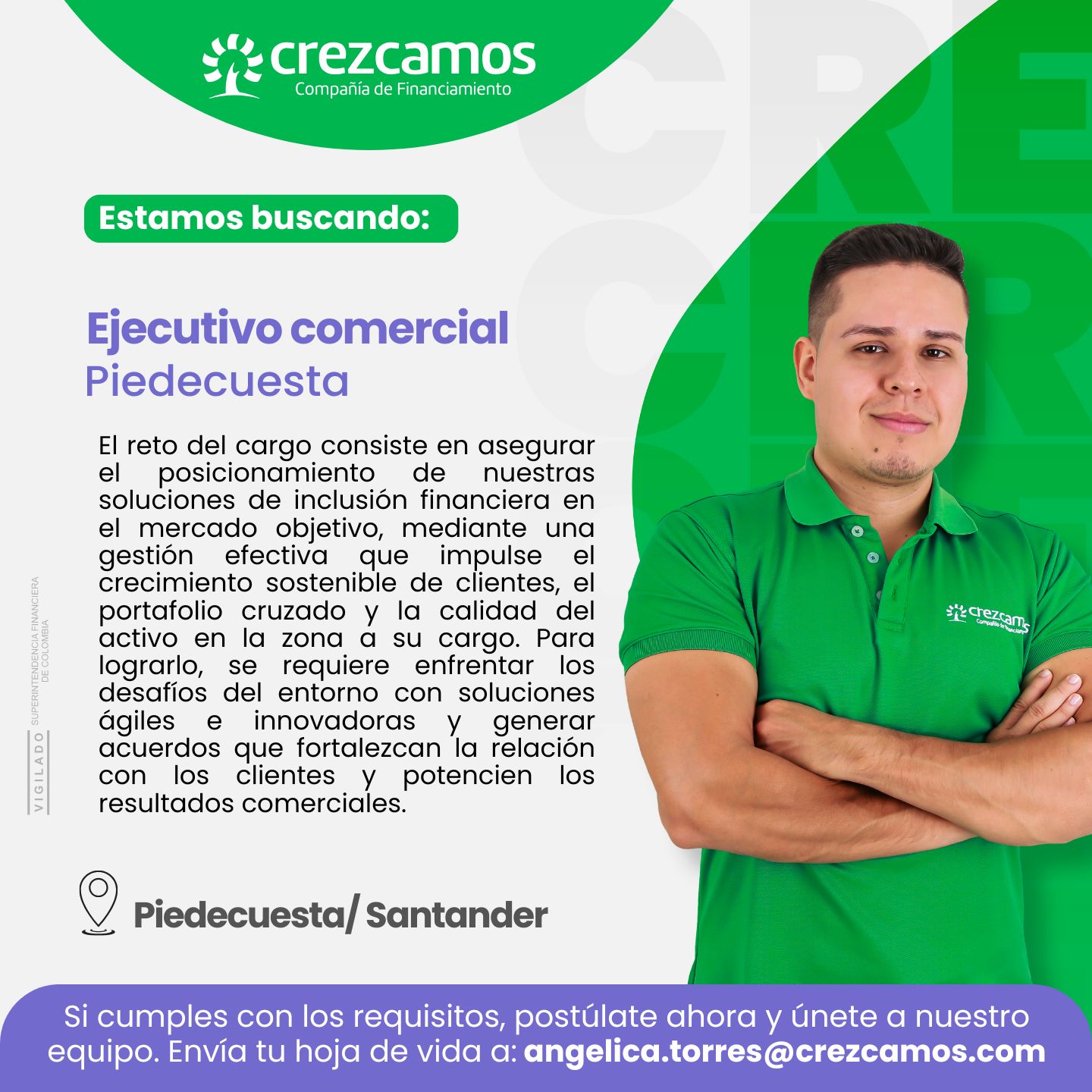 Elige ser parte de Crezcamos! somos una compañía comprometida en ayudar a transformar realidades de las comunidades de menores ingresos a través de soluciones financieras inclusivas. Brindamos espacios donde puedes formarte profesionalmente en liderazgo, habilidades comerciales, estratégicas e interpersonales, que te permitirán crecer y desarrollarte dentro de la organización.